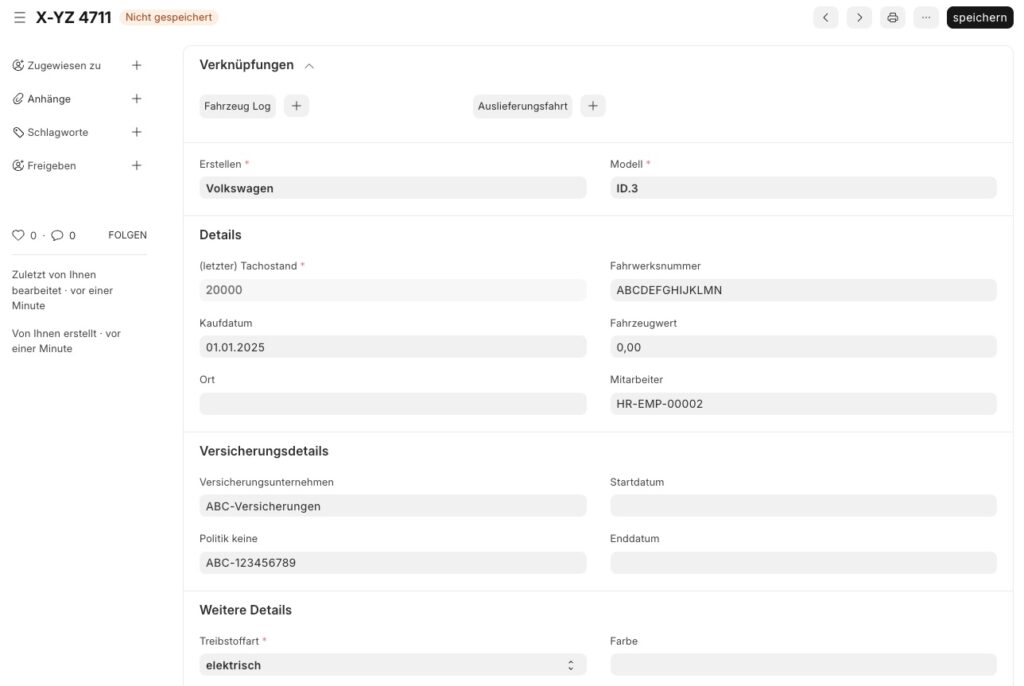 Damit haben wir alle für uns wichtigen Informationen im ERPNext abgebildet. Und wir haben die Grundlagen für weitere Automatisierungen gebildet – next Stop: Automatische Prüfung, ob ein HU-Termin ansteht …