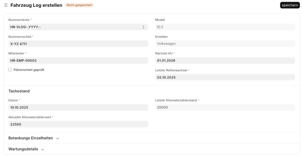 Mit ERPNext kann man wunderbar seine Fahrzeuge (Flotte) verwalten. Dafür gibt es den vordefinierten Objekttyp Fahrzeug (Vehicle). Dieser bietet bereits Felder für Hersteller, Modell, Versicherung, Treibstoff und eine Verknüpfung zur Mitarbeiterin oder zum Mitarbeiter, die/der das Fahrzeug führt. Regelmäßig zu aktualisierende Werte, wie der Kilometerstand, können über Fahrzeug Logs (Protokolleinträge) ergänzt werden. Der dabei zuletzt angegeben Wert ist dann auch auf der Übersichtsseite sichtbar (Fortschreibung).