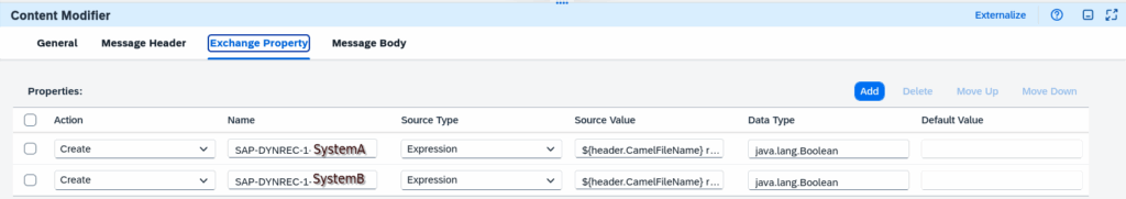 A new conditional exchange property in the Receiver Conditions needs to be added. Important: the name of the property is used to set the receiver as header property. In the example, the receiver is called SystemA, so the property name is SAP-DYNREC-1-SystemA.