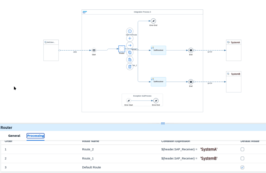 Now, the properties are adjusted, so the next steps work without changes. Later in the integration process, the router, which actually distributes the messages, has to be extended to deal with a new receiver. Add a router to the new system and adjust the processing properties of the router to send messages to the new receiver using the ${header.SAP_Receiver} property.