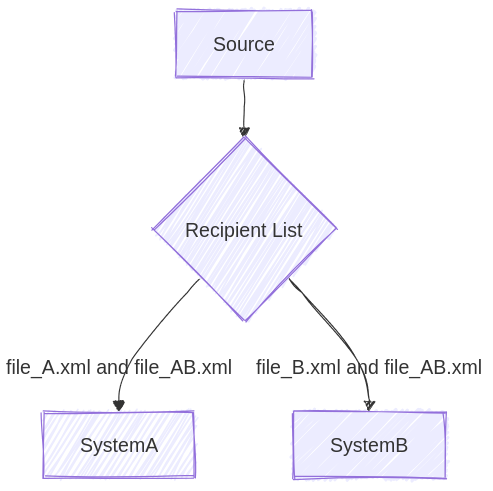 In SAP PI/PO, the integration flow (iFlow) can have a recipient list step. In the configuration of the recipient list, conditions for each route can be entered. The evaluation during the processing does not stop, if one condition is fulfilled. So for our demonstration example, we can simply define a condition matching file_A.xml and file_AB.xml for the route leading to system A (similar for system B). A file with name file_AB.xml matches both conditions and is therefore transferred to both receivers.